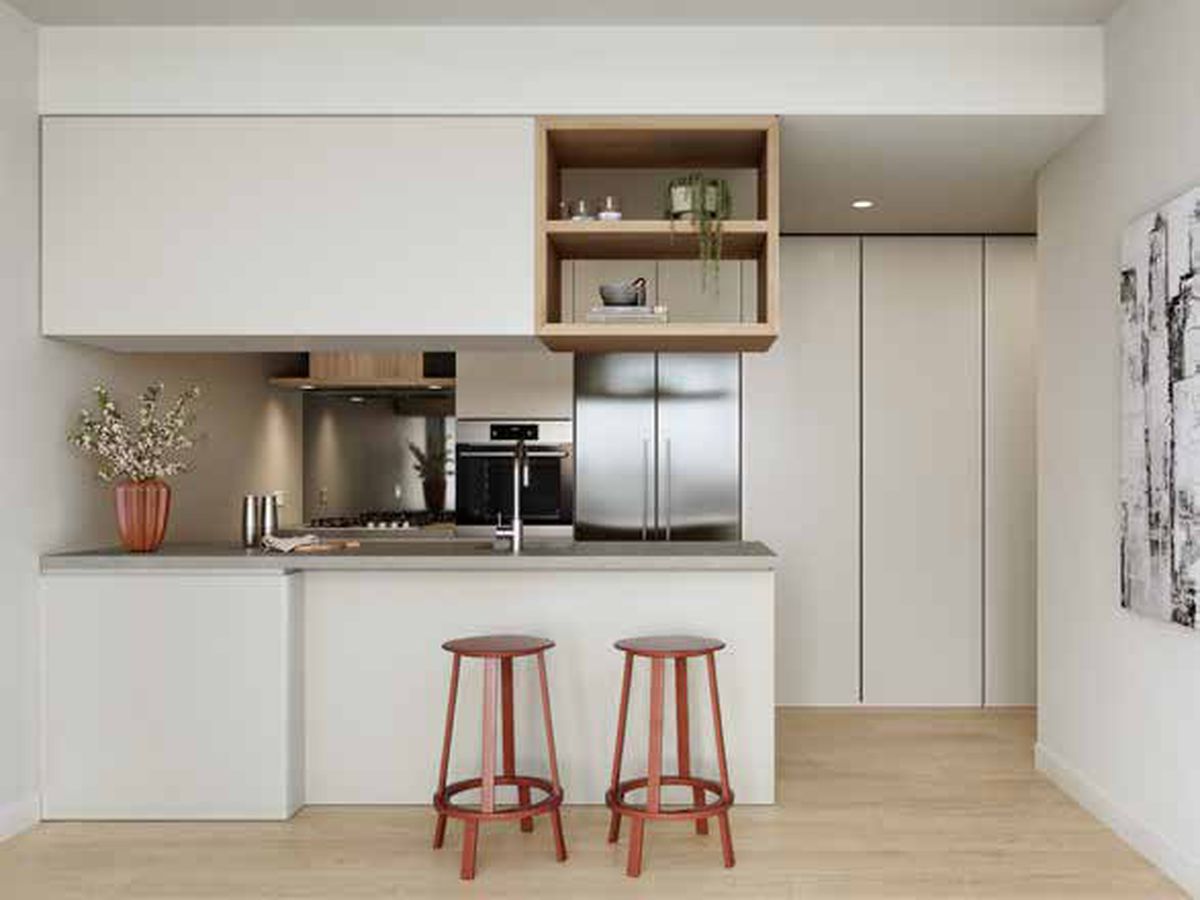 Elevate your culinary experience with our premium kitchen design, featuring top-ofthe- line appliances and high-quality planked urban oak feature joinery. At the heart of each home, kitchens boast stone benchtops that create a sleek and sophisticated cooking space, complemented by a mirrored splashback that adds a touch of glamour.
